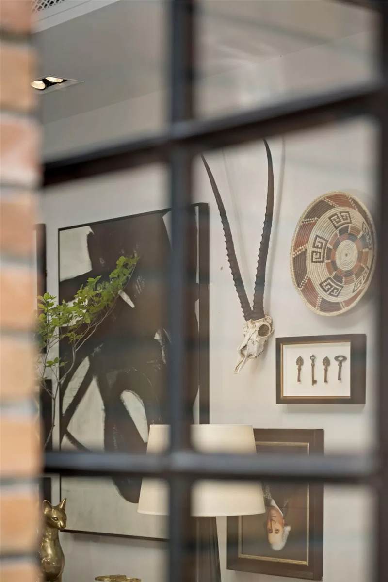 起居室背景展示墻,以混搭風(fēng)格鋪陳出洛普普的敘事展現(xiàn)。原始的羚羊頭飾,彷若征服野性蠻荒,象征勝利光輝。鑰匙是正在延續(xù)著的權(quán)勢標(biāo)志。設(shè)計師用跳色的編織盤與抽象藝術(shù)畫將微量的彩色疊加進(jìn)黑白灰的間隙中,呈現(xiàn)出別樣、細(xì)膩的風(fēng)情。而左下角的守護貓,一如埃及傳說中神秘的幸運守護者,正看顧著明亮通透的窗外,不斷朝曦夕映的美好時光。