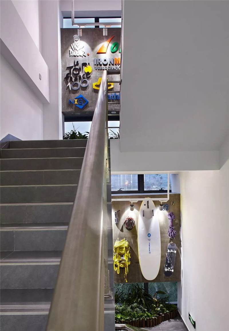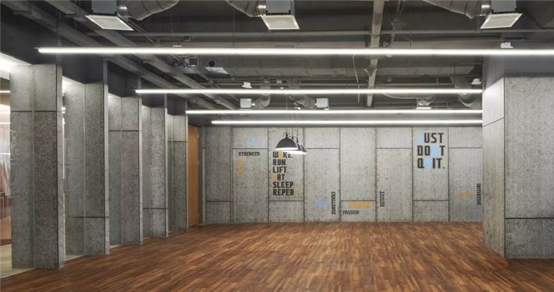 健身房采用的是隔墻類的隔斷,透過(guò)隔墻隔斷玻璃能看到核心筒的走道,核心筒的墻面是一幅大型的噴繪畫(huà),結(jié)合立體字,畫(huà)面比較震撼,再通過(guò)健身房往外看就會(huì)產(chǎn)生非常豐富的層次感。玻璃隔斷上也有小的磨砂圖案,形成了戲劇性的效果,使空間的層次更加突出。
