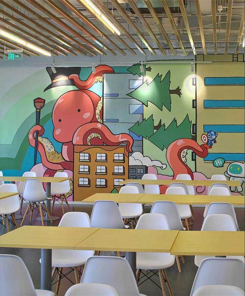 空間氛圍不同,所以圖形裝飾也會(huì)因地制宜的改變,用暖色更動(dòng)態(tài)的感覺(jué)。繪制的粉筆畫(huà),可以定期的更換,像黑板報(bào)一樣制定不同的主題,它就是一面活的展示墻。