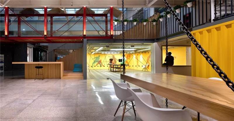 比如這張圖,也是華米科技北京的辦公室,用奧松板開(kāi)兩個(gè)洞,精巧可愛(ài)的睡眠艙趴在墻上,利用兩個(gè)洞把它組成了自行車的輪廓,超萌的壁畫(huà)使墻面不再單一,色彩的對(duì)比更加直觀,同時(shí)用太空艙的形式增添趣味點(diǎn),不論是做設(shè)計(jì)師還是做工匠,都要秉持設(shè)計(jì)的理念去進(jìn)行選材和制造工藝,把握好每一個(gè)細(xì)節(jié)。