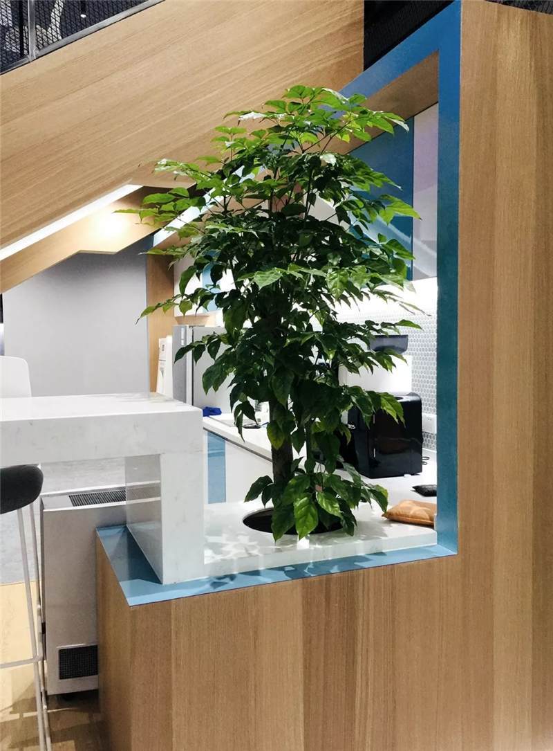 吊柜打破了傳統(tǒng)的平開門形式,使用開放的彩色盒子,實用兼裝飾功能。另外設(shè)計師還根據(jù)層高差,在茶水區(qū)頂部設(shè)計三角形格柵,茶水柜上方及背景墻后方,點綴綠植,使整個空間富有生態(tài)氣息,在光影的效果呈現(xiàn)別樣風(fēng)采。
