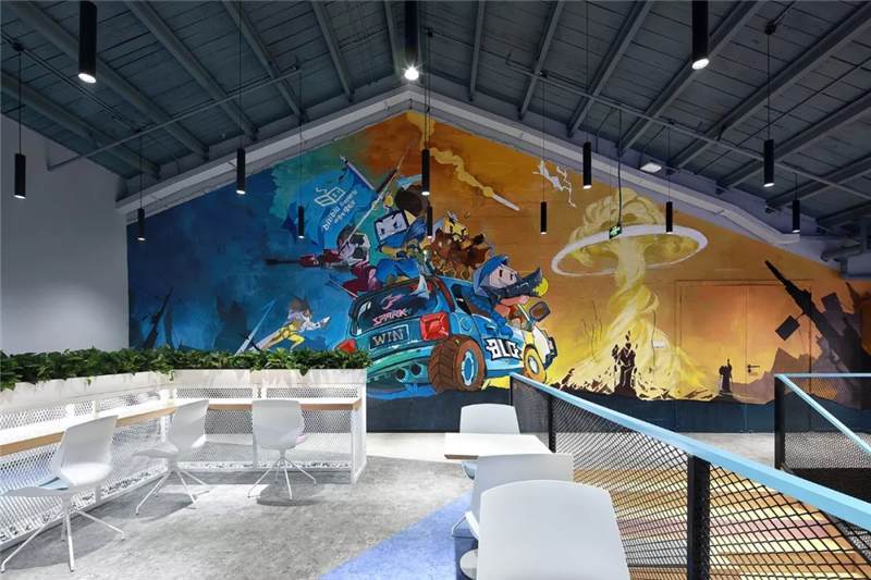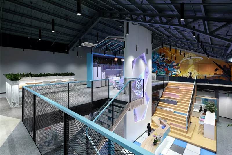 二層大臺階入口處設(shè)計師設(shè)置醒目的電競主題手繪圖,巧妙的把原本的雙開門變成隱形門,墻內(nèi)部為電競導(dǎo)播室。手繪圖豐富的色彩,突出的電競主題,卡通的形象,把BILIBILI的風(fēng)格呈現(xiàn)的淋漓盡致。