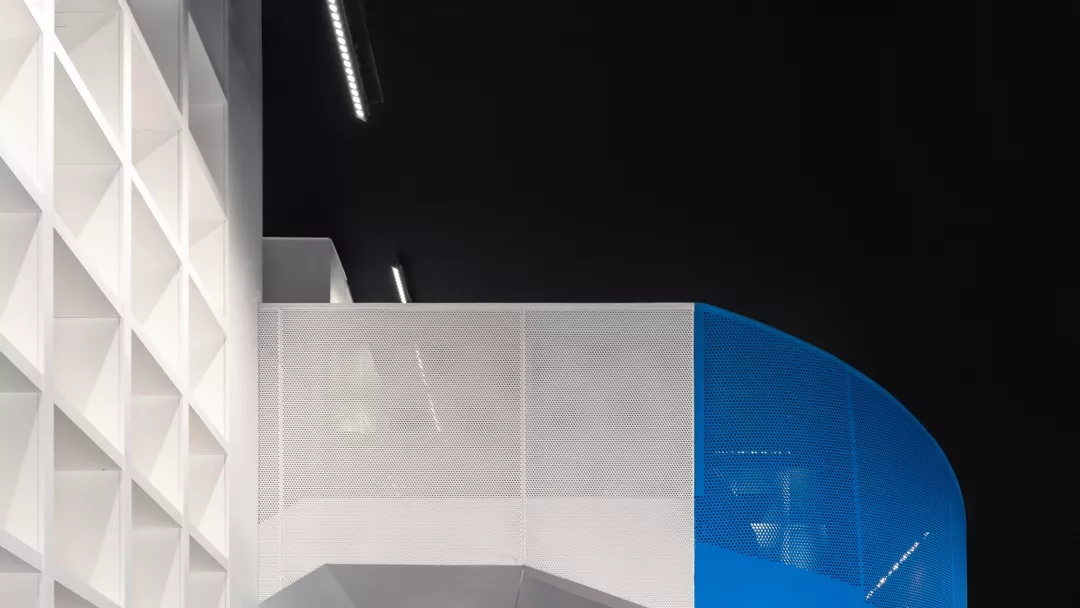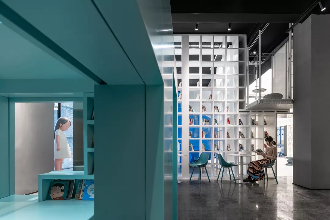 We make the reading room with Tiffany Blue as the core of the Female Box in response to the spiral staircase with Klein Blue at the entry, as well as the external kid’s area with bright yellow color at the back of the box.This community living room would be just a cliché and lose its function of demonstration if it was hidden inside of a commercial space. Youkong Living Room is more like an opening box on its façade. The four-meter high semi open entrance is made of perforated aluminum panels, which is a representational move of Wutopia Lab that from there you can see warm and gentle lightings, bright blue colors and kid‘s laughter.