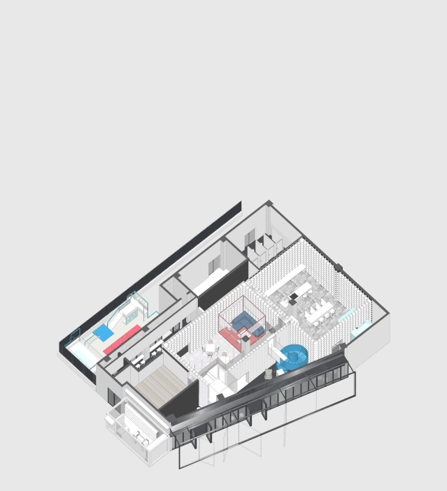 The Service Box is for package delivery;The Social Box works as a living room and reading space;The Female Box is kitchen and kid‘s area. Each box is relatively independent and still connected in some way. We think the Female Box is the core of Youkong Living room since the majority group of residents in community is female and children, the Female Box can not only provide kitchen space, but also work as a party space for residents, which make it the Social Box an extension of Female Box.
