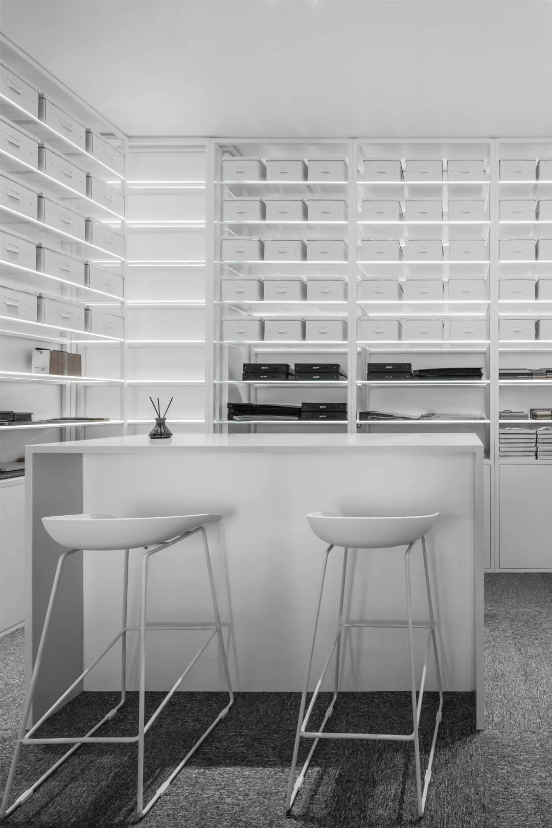 在這里,未知的一切與既有的常識(shí)記憶產(chǎn)生傳導(dǎo),想象思維的觸角開(kāi)始蔓延。小株綠樹(shù)分隔出挑高的白色高座式二人桌,提供了一種更為隨性、更利于面對(duì)面交流的辦公形式。