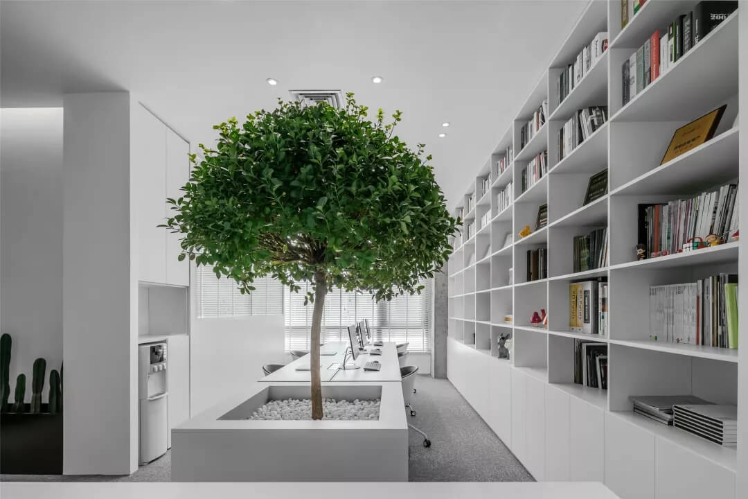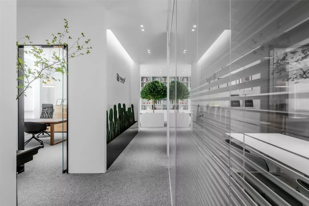 刪繁就簡(jiǎn),以最經(jīng)典的白色為主題搭配色調(diào),沒(méi)有繁瑣的辦公室設(shè)計(jì)和過(guò)多的裝飾,減去辦公中的壓抑感。通過(guò)將自然純凈的白色與沉靜黑色相結(jié)合,將品牌形象簡(jiǎn)潔地呈現(xiàn)表達(dá),同時(shí)為左右空間的過(guò)渡創(chuàng)建和諧觀感。純白的墻面,接近心靈的澄凈;仙人掌是視覺(jué)的焦點(diǎn),恣意生長(zhǎng)、堅(jiān)韌、夯實(shí)根基,也正寓意著公司的設(shè)計(jì)理念:有所依、有所仗、有所長(zhǎng)。