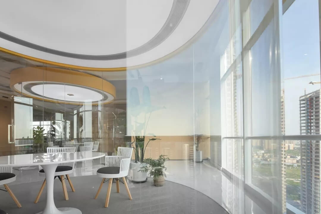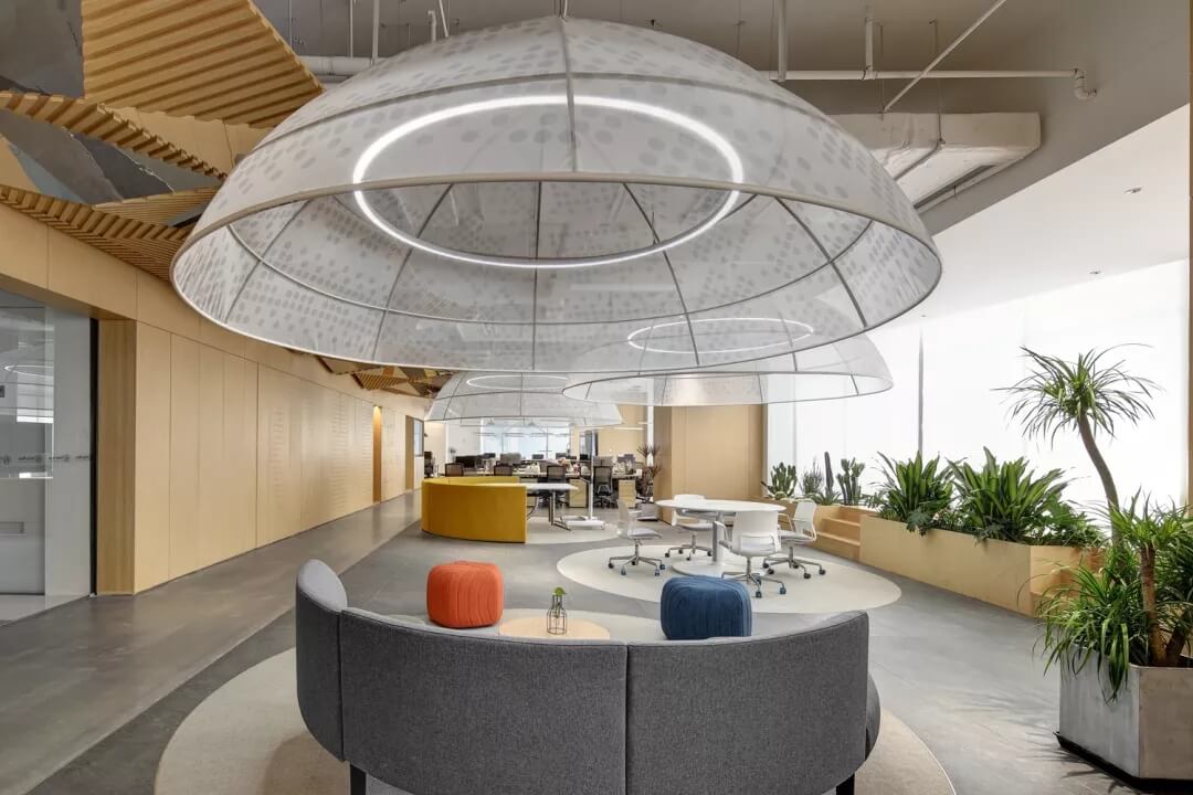 活動辦公區(qū)的圓頂造型再次運用了“圓形”元素,使得空間首尾呼應。圓形的劃分使大面積的接待區(qū)在使用上更加靈活,網(wǎng)紗狀燈罩的設(shè)計增加了空間視覺上的朦朧感,使空間的使用更具舒適性。