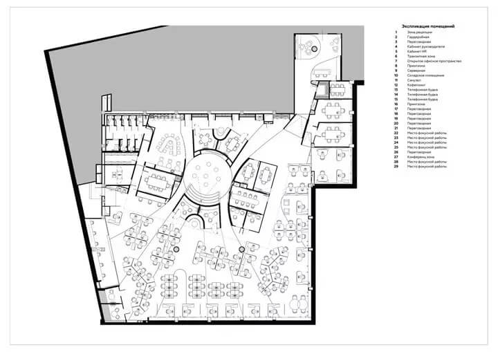 計(jì)概念的靈感來源于公司的名稱——L'or(法語,意為gold金色)和aurele(法語,意為halo光環(huán))。“金色光環(huán)”的品牌寓意成為整個(gè)空間形式的構(gòu)造背景,整個(gè)辦公室的主動(dòng)線也圍繞著一個(gè)圓環(huán)來規(guī)劃。這個(gè)中心圓環(huán)被定義為一個(gè)明亮的核心空間,形成一個(gè)中心會(huì)議大廳,周邊分布著或開放或封閉的會(huì)議區(qū)。