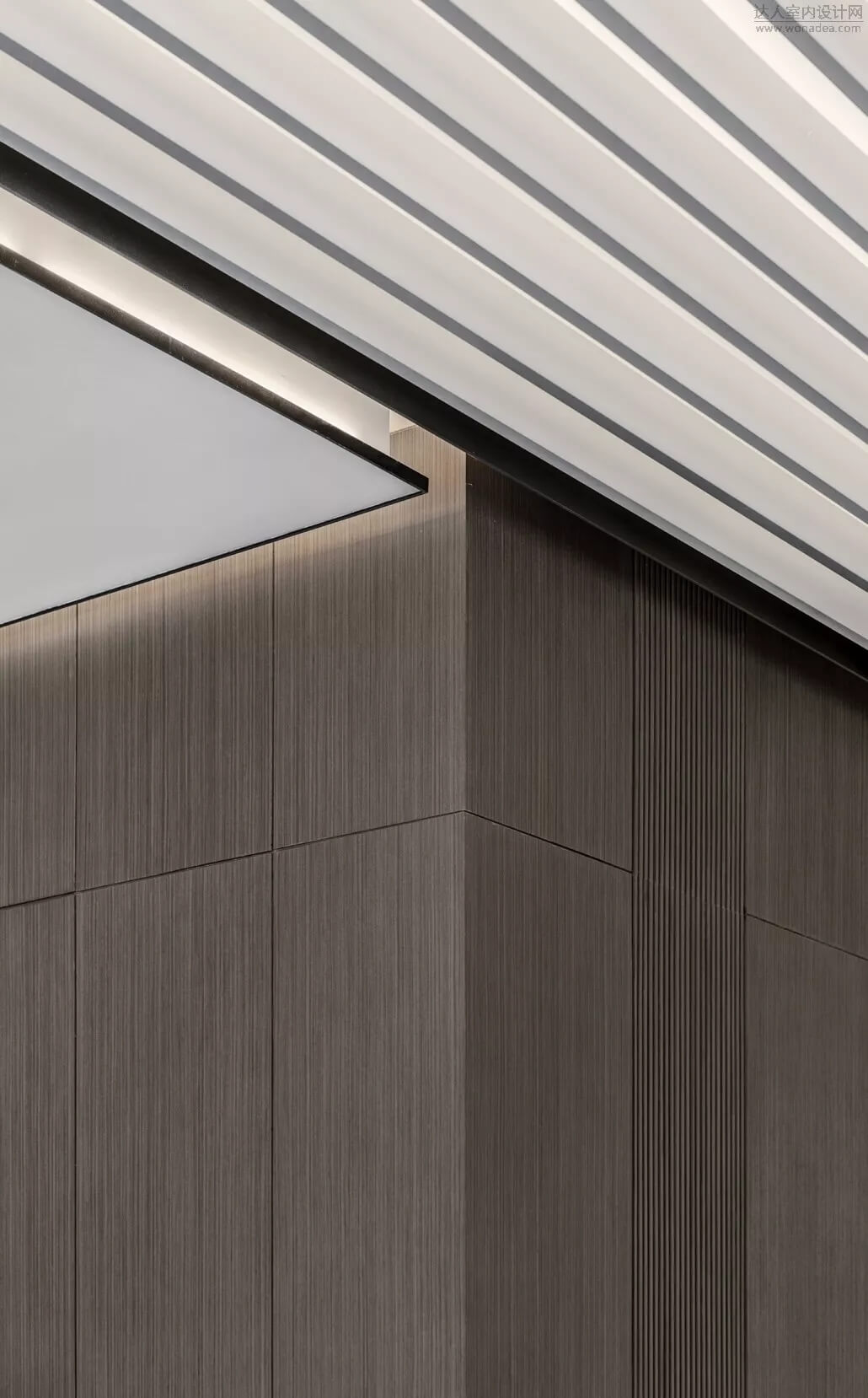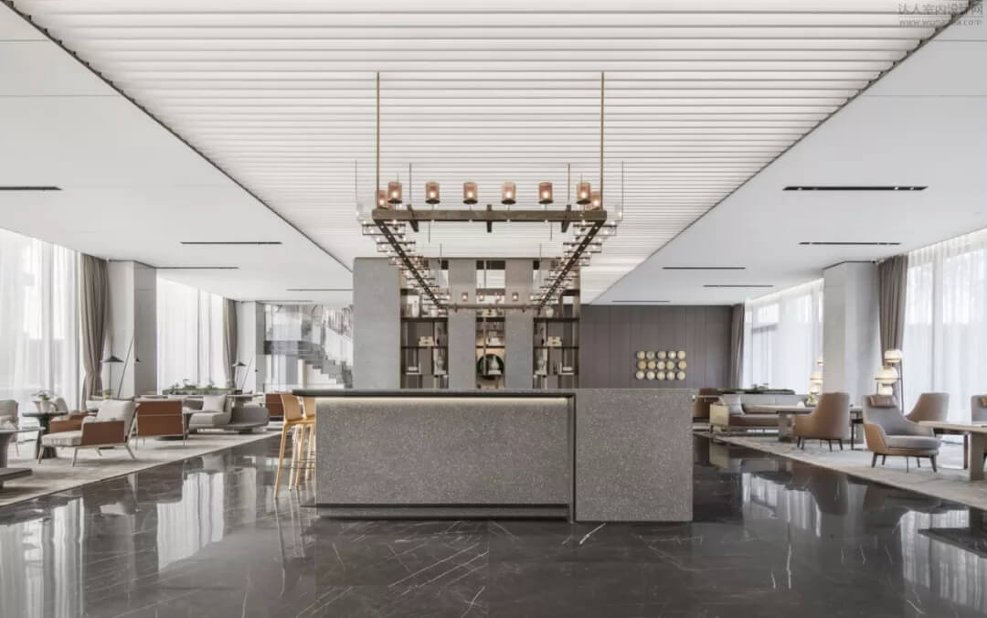 通過豐富的景觀區(qū)進入門廳,感受到空間的空靈,立面設(shè)計過濾了來自于外界的繁復(fù)。十米挑空的大廳,墻面以米色砂巖為基底,黃銅色金屬強化縱向的比例,凸顯出空間的氣勢。入口對景設(shè)置的水景讓穿梭其中的訪客仿若能傾聽到潺潺水聲,同時水景和懸掛的軟裝裝置相得益彰,充滿巧妙的用意,同時也分隔了挑高通透的玻璃幕墻,虛實結(jié)合,體現(xiàn)現(xiàn)代設(shè)計的東方神韻。