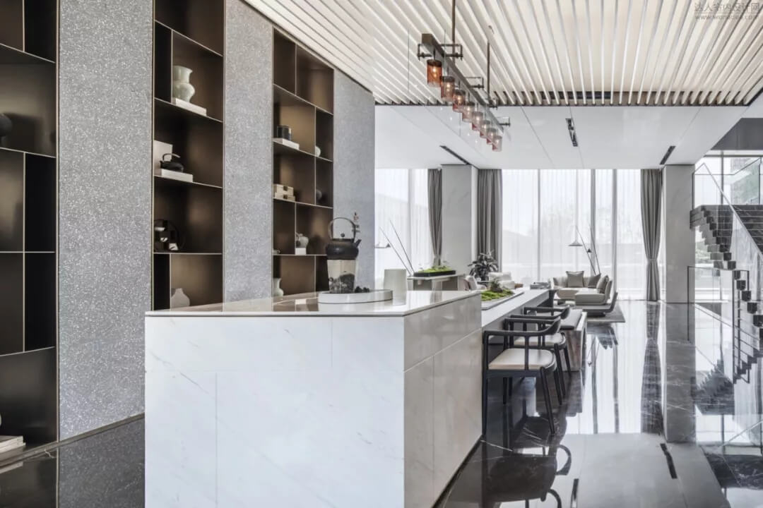 進入洽談區(qū)大廳,通過大面積全明落地玻璃窗,最大程度地將室外的建筑、景觀效果納入室內(nèi)視野,以觀景式空間概念記錄時移景易的歲月縮影。圍合形的水磨石吧臺猶如藝術(shù)裝置,成為空間的中心焦點。