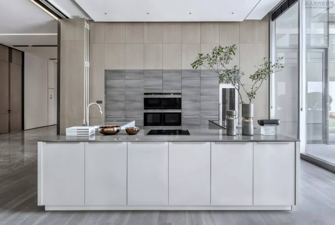 私宴,是以當代設(shè)計來描繪文人飲酒時追求的清雅意境,寄情於山水??臻g通過折疊門和西廚吧臺區(qū)產(chǎn)生互動,空間功能既獨立又有相互滲透。延續(xù)簡潔流暢的線條,布置與空間密切配合。