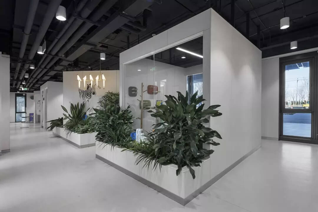 至于盒子以外的空間,我們想凝聚更多的人文藝術氣息,選擇較多地去鋪陳展示各種抽象的藝術線條和畫作,同時為了不失去生活氣息,各個角落選擇顏色比較跳躍的家居什物,讓它作為一個流動的戶外廣場,讓人可以自在穿行其中,偶爾停駐觀察,經得住人聲鼎沸的喧擾,亦能提供心靈靜憩的安寧。在這里,大家認真辦公、生活、盡情交流、分享,它就是一個安放綠意,有極高包容度的公共空間。