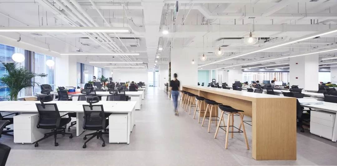 設(shè)計師在開放式的辦公區(qū)域設(shè)置長條吧臺桌,供員工自由討論辦公,午間用餐等,同時開放辦公區(qū)與南側(cè)公共島空間相連,員工可攜帶筆記本在這里沐浴著陽光辦公,討論,商務(wù)洽談,休憩等。