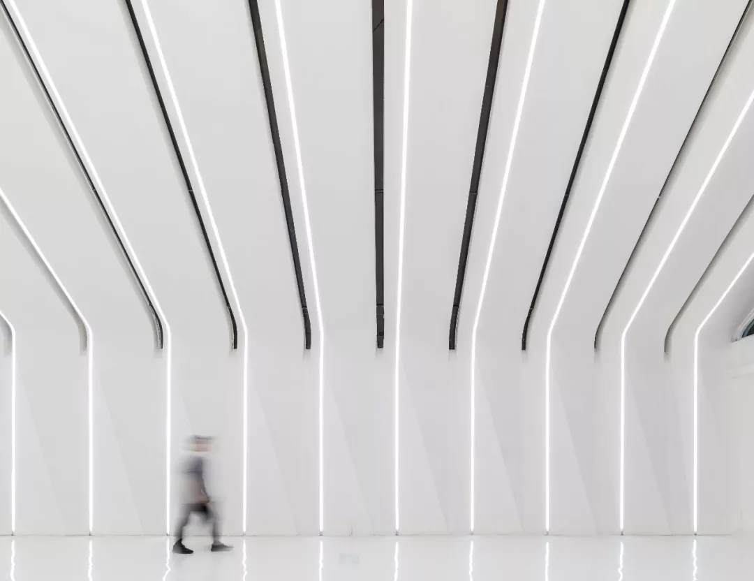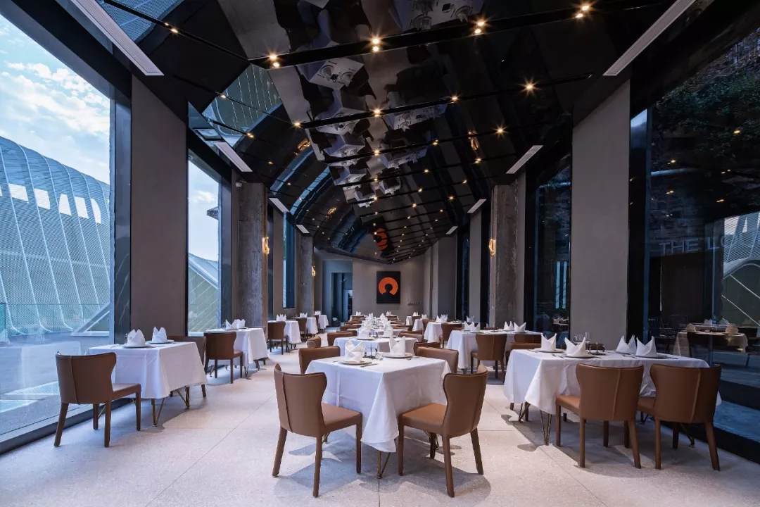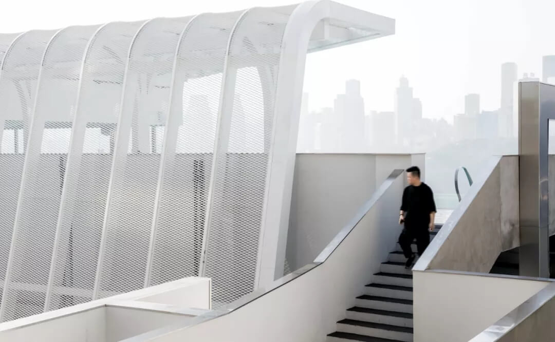 薄殼結(jié)構(gòu)與金屬幕墻構(gòu)成的“裙擺”創(chuàng)造出一層集合酒店接待、休憩與多功能廳的開放服務(wù)空間,漂浮為頂,下落為幕,抬升為廳,下沉為梯,旅客可以在裙擺之上游走,形成一條多變的觀景路徑,還原了山城的空間體驗。