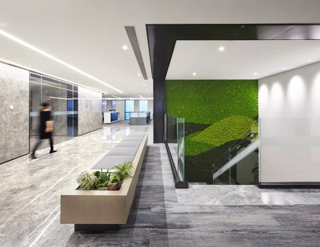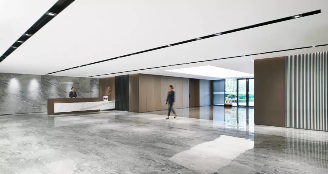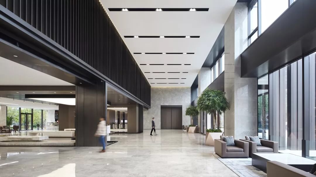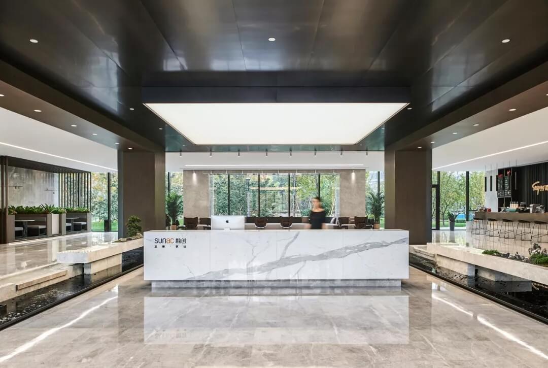 大堂是開放,通透,自然的園林式空間,自成一片天地。踏入大堂即可看到前廳接待島,方形四面通透的造型,嚴(yán)謹(jǐn)不失靈活,結(jié)合流動水景和盆景,營造了生態(tài)的,四季怡情的綠色辦公。電梯廳出入口在接待島兩側(cè),實現(xiàn)快速集散,避免上下班高峰期等候擁堵。咖啡等候區(qū)玻璃窗形成框景,把室外花園內(nèi)的四季變幻,自然元素都納入到室內(nèi)來,形成情景共融。