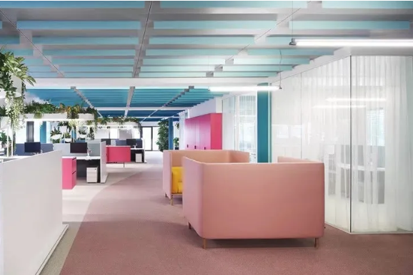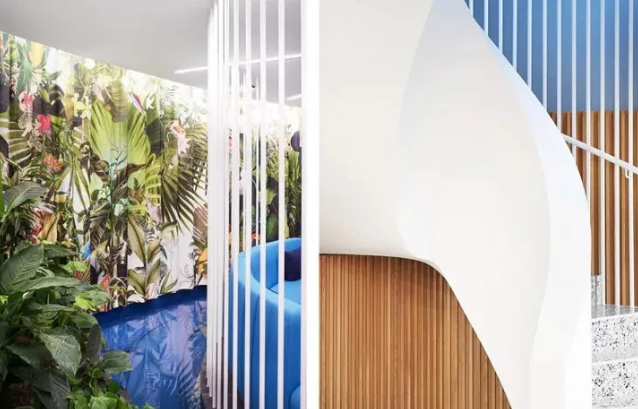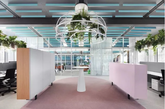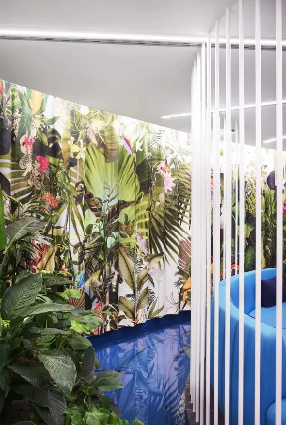 工作區(qū)采用中性色設(shè)計(jì),利于專注工作。淡粉色的走道是真正的情緒助推器,它喚起了員工之間的情感共鳴。精心布置的水源和雅致的燈光設(shè)計(jì)有助于帶來更愉悅的心情。熱帶壁紙與柔軟的沙發(fā)和小圓桌塑造了一個(gè)熱情洋溢的活力氛圍。