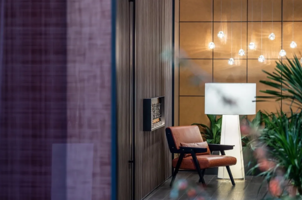 前廳一角,一把隨意的休閑椅構(gòu)設(shè)出安靜而獨(dú)立的等候區(qū)。光是一味奇妙而誘惑的催化劑,見(jiàn)證格柵的參差錯(cuò)落,旖旎于水滴狀通透吊燈,如同午夜巴黎那一杯令人情迷的威士忌,透過(guò)光影的變幻,實(shí)現(xiàn)精尚定調(diào)。
