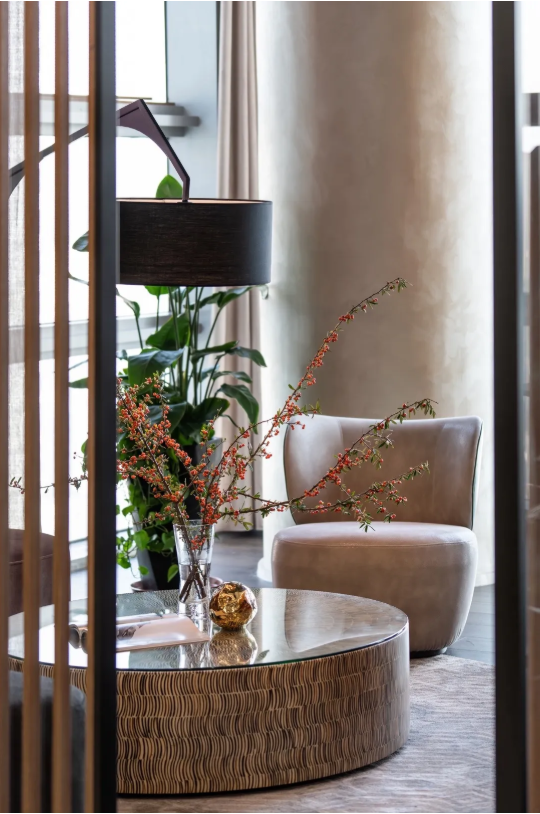接待區(qū)以弧形沙發(fā)圍合成互動(dòng)性強(qiáng)的洽談狀態(tài),金屬紋理圓幾在光的參與下呈現(xiàn)精致的一面,格柵半掩,意式沙色時(shí)尚簡(jiǎn)約家具,凸顯了實(shí)用與美學(xué)的無(wú)聲契合。