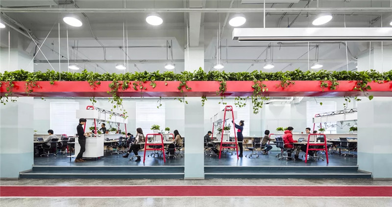 5個公司由一個中間懸掛的“紅環(huán)”聯(lián)系在一起,紅環(huán)上種植蔬菜與植物,下面對應(yīng)的是跑道。員工在跑道健步的同時可以打電話,也可以與照料植物的同事進(jìn)行交談。