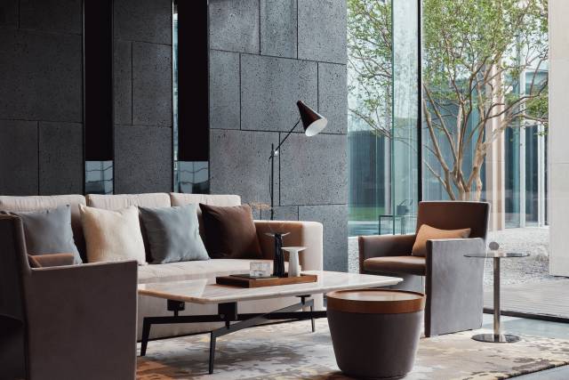 步入大廳,通過“借景”手法,將頗具詩情畫意的東方園林之景鋪呈在眼前,一抹翠綠更是讓整個空間靈動起來,巧妙而又極具視覺沖擊。在陽光照射下,投影又成為景觀的一部分,展示出自然與建筑的互動,活躍且適宜。一大排落地窗串聯(lián)起室內(nèi)外關(guān)系,正是光線的引入,讓建筑、景觀、室內(nèi)形成有序的一體。沿著預(yù)接待吧臺的動線向前穿引,便是整個銷控區(qū)域。