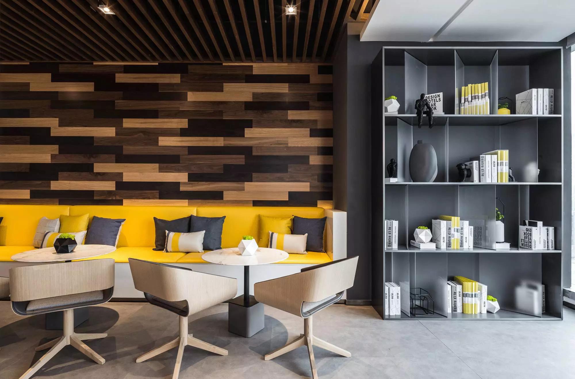 設計師用藍與灰搭配出冷靜主色調,綴以沙發(fā)的暖意來提亮空間,而背景以深淺原木交錯搭配,設計流于細節(jié)之中。閑時,或仰臥在沙發(fā)上、在其旁邊的書柜看一會兒閑書,或坐在沙發(fā)上與同事聊聊天、聽一段舒緩的音樂、下一盤棋,小憩之后再投入工作,想必效率也會更高。