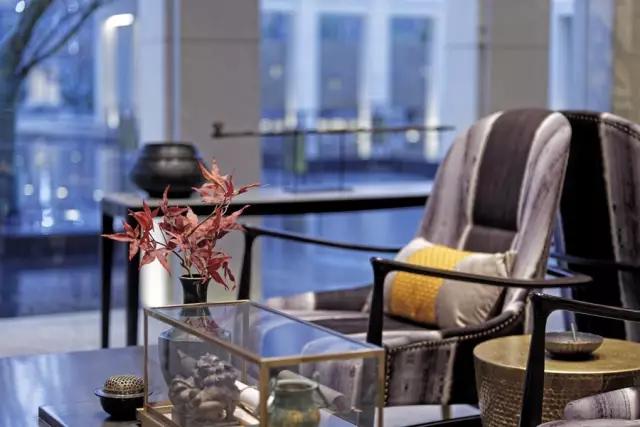 玻璃窗外,暮色朦朧氤氳中,充盈著自然的綠意,一處盆景,暖樹染綠,更添別樣情致。深色的金屬和皮革的質(zhì)感,簡化形態(tài)的中式家具,香爐書卷,幾處綴花,穿越時空,對話古今。“到處皆詩境,隨時有物華”大抵如此。
